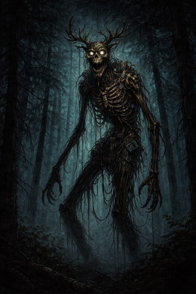 • stretched skeletal limbs • a torso that appears almost hollow • antler-like protrusions or branching shapes • a mouth that seems too wide for the skull